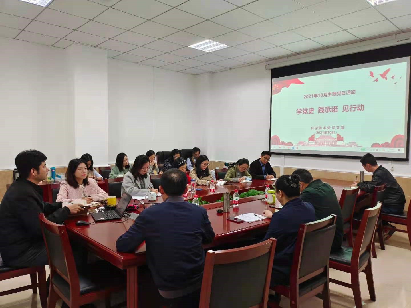 10月15日下午,按照学校部署要求,科技处党支部在南区行政楼104会议室集中围绕“学党史 践承诺 见行动”开展主题党日活动。活动由支部书记黄斌同志主持,具体学习内容由大科学装置办公室主导讲解。