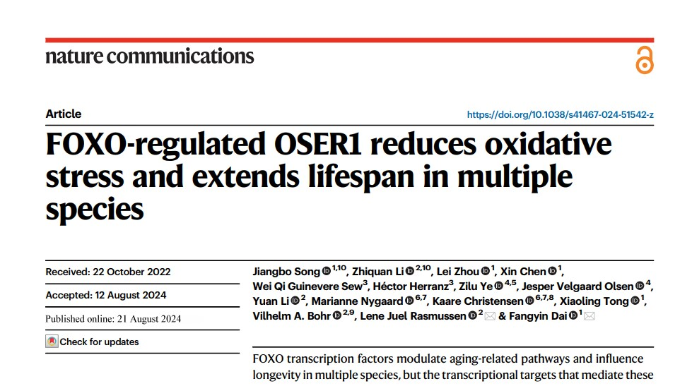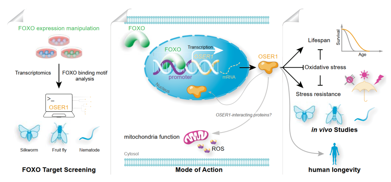 betway88西汉姆网页资源昆虫高效养殖与利用全国重点实验室代方银教授团队发现了调控寿命的新基因OSER1,并在家蚕、线虫、果蝇等多物种中研究揭示了其通过提升机体对氧化应激的防御力而延缓衰老和延长寿命的保守性机制,且该基因对寿命的影响得到人类受试者研究结果支持,展示了OSER1作为实现健康衰老和延长寿命的关键调控靶标的重要前景。研究论文“FOXO-regulated OSER1 reduces oxidative stress and extends lifespan in multiple species”已于8月21日在国际知名期刊《自然通讯》(Nature Communications)在线发表。
