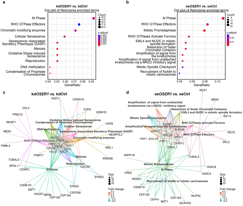 在人类U2OS细胞中,对OSER1过表达系和RNAi敲降系中的差异表达基因分析表明,OSER1被敲降后,差异表达基因主要富集在细胞衰老、衰老相关分泌表型(SASP)、氧化应激诱导的衰老、繁殖等生物学过程,这些生物学过程之间存在密切的关联(图7)。在家蚕中,过表达BmOSER1增强了雄蛾的交配活力,有效交配次数大幅增加,而敲除BmOSER1则降低了雌蛾的产卵量;在秀丽隐杆线虫中,Ceoser1过表达能够显著提升子代数量。这些结果共同证实了OSER1在繁殖中的重要调节作用(图8)。