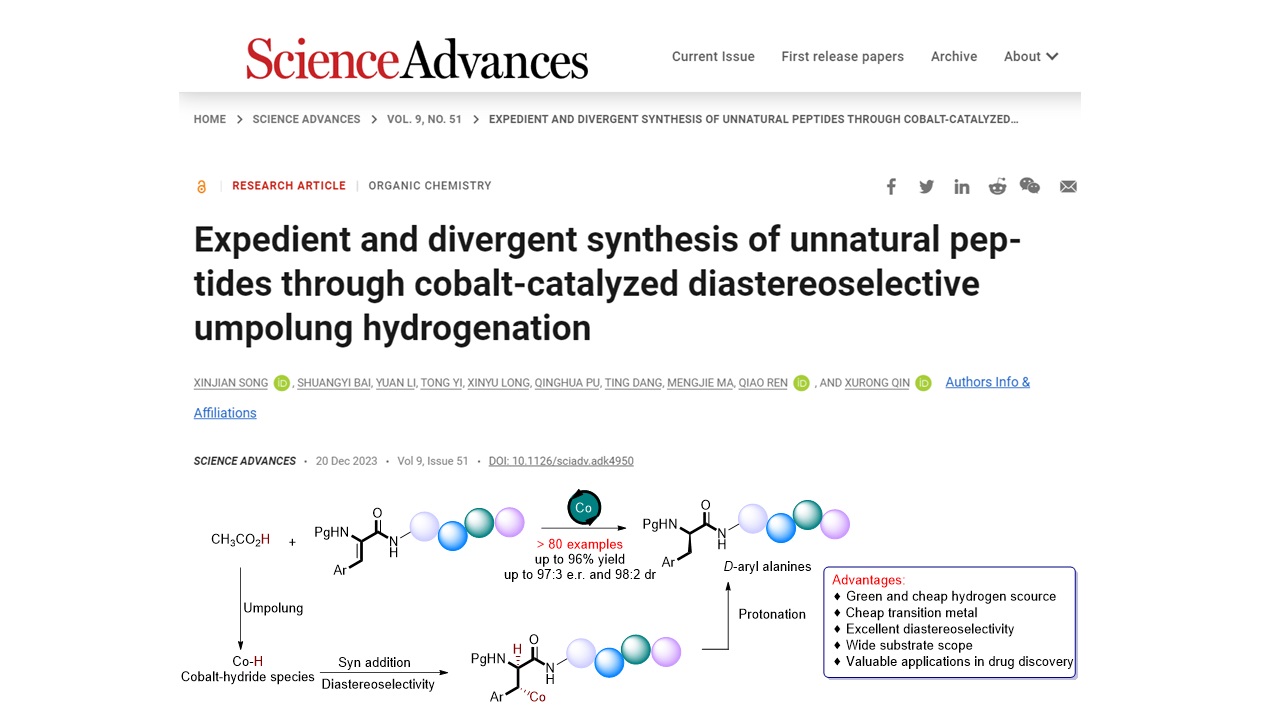 近日,药学院 中医药学院秦绪荣教授、任巧副教授研究团队以廉价的过渡金属钴盐为催化剂成功地以高产率和高非对映选择性构建了非天然芳基丙氨酸多肽分子库。该反应采用了极性反转策略,利用醋酸和甲醇作为氢源,避免了危险高压氢气的使用。同时,此策略省去了预先合成非天然芳基丙氨酸的冗长步骤;并且产物不会发生外消旋化或差向异构化。相关研究成果发表在国际知名期刊《Science》子刊《Science Advances》上,题为《钴催化非对映选择性氢化合成非天然芳基丙氨酸多肽》(“Expedient and divergent synthesis of unnatural peptides through cobalt-catalyzed diastereoselective umpolung hydrogenation”)(https://www.science.org/doi/10.1126/sciadv.adk4950)。