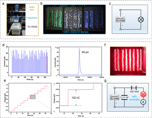 图2:基于位移电流和全电流纳米发电机的纳米能源系统对比以及TC-TENG的输出性能演示。