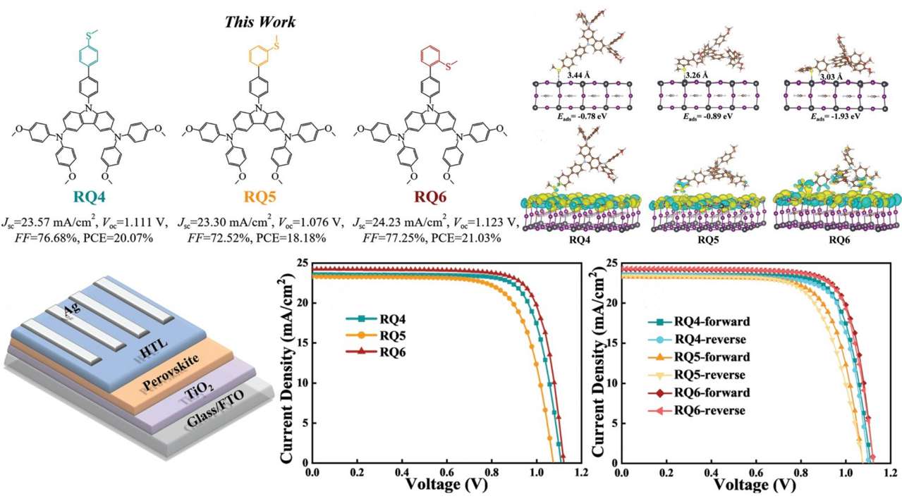 为了深入理解分子异构化的结构-功能-性能的相关性,该工作在基于咔唑-芳胺衍生物的分子侧链上不同位置引入甲硫基(-SMe),构建了三个异构体分子(RQ4、RQ5和RQ6)。利用DFT、TD-DFT和Marcus理论,模拟了它们的几何结构、前沿分子轨道能级、光学吸收和空穴传输等性质。基于量子化学的从头计算方法,构建了钙钛矿/RQ4-RQ6界面模型,模拟了界面电荷转移和钙钛矿/ RQ4-RQ6界面之间的相互作用。虽然异构体能表现出相似的前线分子轨道能量和光学吸收性质,但是这些异构体在空穴迁移率和钙钛矿/RQ4-RQ6界面等表现出明显的差异。为了验证分子设计策略和计算模型的合理性,合成了分子RQ4-RQ6并用于制备PSCs器件。在相同条件下,相比异构体RQ4和RQ5,基于RQ6器件的PCE明显提升,并优于典型的Spiro-OMeTAD的器件效率。RQ6在PSCs器件中的性能提升主要归因于其良好的空穴提取、高空穴迁移率、强界面相互作用以及在钙钛矿/HTMs界面处的有效电荷转移。实验现象与理论模拟结果一致,验证了计算模型的可靠性,该工作提供的侧链官能团异构化策略是获取潜在HTMs的有效途径。
