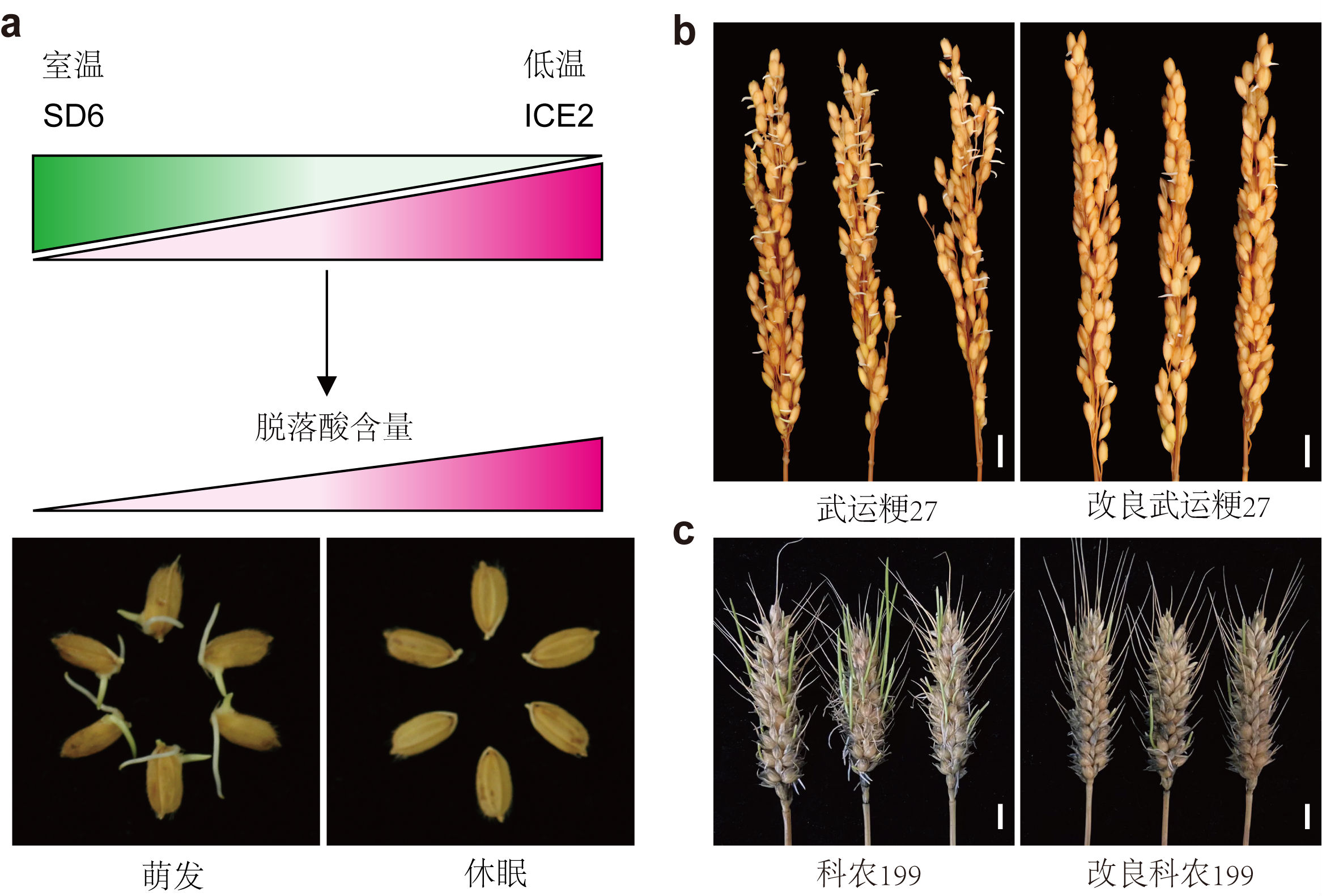 a图为SD6/ICE2分子模块作用模型示意图。b图为改良前后水稻品种穗发芽情况。c图为改良前后小麦品种穗发芽情况。