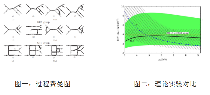 强相互作用具有渐进自由的特征,即高能量标度时相互作用较弱,因而微扰可算,低能量标度时相互作用很强因而体现为非微扰效应。因子化定理能够将一个物理过程的微扰和非微扰物理效应系统的分离,是处理高能粒子物理过程的重要研究手段。基于NRQCD因子化定理,桑文龙老师与合作者研究了矢量底夸克偶素衰变到一对粲夸克偶素的两圈图修正。该工作主要有以下几个创新点:1. 研究涉及到六个外腿的两圈费曼图计算(见图一),属于该领域的最前沿计算之一;2. 对于多举衰变过程,NRQCD因子化定理还没有严格证明,该工作首次在如此复杂的结构中验证了理论框架的正确性;3. 粒子的极化产生是强子对撞机上尚未解决的热点研究问题,该工作提出了在衰变过程中测量极化参数,可以辅助对撞机实验加深对问题的理解; 4. 先前的研究表明此过程的领头阶理论结果对能量标度依赖非常敏感,因而很难给出精确的理论预言,该工作获得的辐射修正能够极大的压低标度依赖行为,而且理论计算与日本大型轻子对撞机上BELLE实验测量结果符合的很好(见图二)。