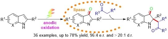 近年来,一些酶被发现具有非天然的催化活性(Enzyme promiscuity),即一种酶可以催化除“天然”反应外的其他化学变化。这极大地拓展了酶催化有机反应的范围。该研究中,官智、何延红团队发展了一种脂肪酶的非天然催化活性与有机电合成相结合的策略,实现了2-取代吲哚化合物与简单脂肪酮的不对称氧化交叉偶联反应。首先,2-取代吲哚在阳极通过介质4-乙酰氨基-2,2,6,6-四甲基哌啶-N-氧化物(ACT)被间接氧化,得到关键中间体2-取代吲哚-3-酮,接着小麦胚芽脂肪酶催化2-取代吲哚-3-酮与其他简单脂肪酮的不对称烷基化反应,以良好的收率和对映选择性直接合成了多种具有立体季碳中心的2,2-二取代-3-羰基吲哚化合物。作者通过一系列的控制实验和机理研究,证明了涉及自由基的电化学氧化过程以及脂肪酶的不对称催化机制。