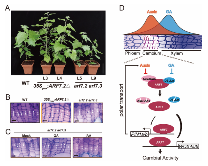 木材作为天然的可再生资源,被造纸,板材加工,家具制造、新材料生产等行业广泛使用。木材独特的材料结构和显著的各向异性赋予了它一系列显著的性能,为功能材料的设计提供了机会。木材的形成与生活,经济,科技发展息息相关,对于木材的需求日益上升,如何实现木材的增产增收成为关系到国计民生的重要问题。木材是指木本植物成熟的次生木质部,经由茎中环状分布的干细胞——形成层分裂分化而来。形成层持续的活动决定了木本植物多年的生长,也是决定木材产量的关键。是否可以通过调控形成层的活性加速木材生产?木材形成要经历形成层细胞分裂与分化、细胞膨胀,次生壁沉积,细胞程序化死亡等过程。形成层活性的维持已被报道受到多种转录因子和激素的调控。WOX4转录因子作为形成层活性调控的核心,响应激素、小肽等信号,维持形成层活性。生长素极性转运蛋白PIN1促进生长素在形成层的高量累计,促进形成层活性。激素外施实验表明,赤霉素和生长素能够协同调控形成层活性,促进木材形成,但其作用机制尚不清楚。