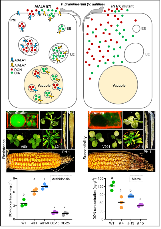 P4-ATPases是仅发现于真核生物中的磷脂翻转酶。它通过ATP的驱动将特定的磷脂从细胞外层膜翻转到内层膜,在细胞双层膜间磷脂的非对称排列及囊泡的形成与运输中发挥重要功能。但迄今为止,人们对P4-ATPases在真菌毒素细胞解毒中的功能知之甚少。该研究以禾谷镰刀菌毒素DON(呕吐毒素)与黄萎病菌毒素CIA为筛选剂,在拟南芥中鉴定出两个参与真菌毒素细胞解毒的P4-ATPase基因:AtALA1和AtALA7。研究结果表明,AtALA1和AtALA7介导的囊泡运输,能分别将这两种毒素包裹在囊泡中,转运至液泡隔离和降解,从而实现细胞解毒。超量表达AtALA1与AtALA7显著提高了转基因植株对禾谷镰刀菌与黄萎病菌的抗性。重要的是,AtALA1转基因玉米和拟南芥种子中的呕吐毒素含量大幅度降低。该研究丰富了我们对P4-ATPases功能的认识,利用这种囊泡运输相关的细胞解毒策略,可以跨物种实现对不同病原菌小种的广谱抗性,对提高植物对毒素相关病害的抗性有显著效果;同时为降低真菌毒素对食品安全的危害开辟了新途径,具有重要的应用前景。