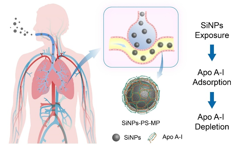 矽肺是长期呼吸暴露大量游离二氧化硅颗粒所引起的以肺部损伤为主的疾病,在世界范围内尤其是发展中国家具有广泛的患病人群。近年来,流行病学研究揭示了游离二氧化硅的暴露乃至空气污染和心血管疾病之间的潜在关系;而细颗粒物的暴露对心血管系统的损伤机制,仍有待进一步探究。该研究阐述了纳米二氧化硅通过吸附并耗竭功能性蛋白质,诱导心血管损伤的新机制。通过呼吸暴露的纳米二氧化硅能够在肺泡中吸附肺表面活性物质,随后穿过气血屏障进入血液循环。肺表面活性物质的包裹显著促进纳米二氧化硅在血液中吸附载脂蛋白A-I,这样的吸附显著缓解了纳米二氧化硅的细胞毒性和促炎效应。然而纳米二氧化硅在血液中的快速清除,导致血液中的载脂蛋白A-I被不断耗竭。载脂蛋白A-I在脂质转运中具有重要角色,可以拮抗动脉粥样硬化的发生。因此,长期呼吸暴露纳米二氧化硅的小鼠产生了明显的心血管损伤,而载脂蛋白A-I模拟肽的补充则显著缓解了该损伤。在临床样本中,矽肺患者血清中的载脂蛋白A-I的浓度较健康人乃至冠心病患者显著降低,进一步验证了纳米二氧化硅暴露对载脂蛋白A-I的清除作用。本研究为纳米颗粒暴露诱导的心血管毒性效应提供了新的思路。
