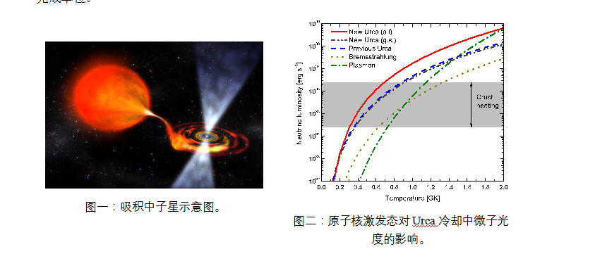 在该工作中,王龙军副教授与合作者首次探讨了原子核的激发态对吸积中子星外层(外壳层和海洋层)的Urca冷却机制的影响。Urca过程指的是一对原子核在一些特殊的外部条件下,通过相互之间的电子俘获和贝塔衰变,放出大量的中微子与反中微子,后者会带走大量的能量从而导致所处环境得到冷却的一种核过程。如图二所示,他们通过研究发现,考虑了原子核的激发态效应以后,Urca冷却过程的冷却效率(即中微子光度)比以往的认识增加了很多倍,从而超越了其他的冷却过程、抗衡并压制了各种加热过程的效率总和,进而起到快速而有效地冷却吸积中子星外层环境的作用。