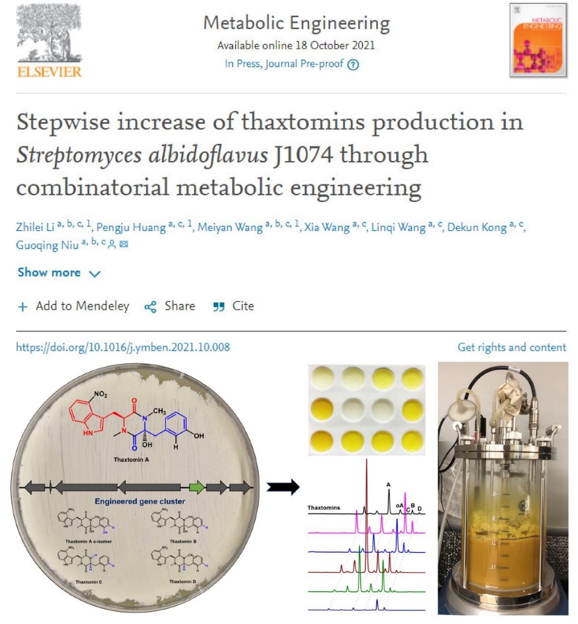 近日,生物技术中心牛国清研究员团队运用组合代谢工程策略实现了天然除草剂莎斯托明产量的大幅提升,为其工业化生产和应用奠定了基础,相关成果以“Stepwise increase of thaxtomins production in Streptomyces albidoflavus J1074 through combinatorial metabolic engineering”为题发表于代谢工程领域权威期刊《代谢工程》(Metabolic Engineering)。本工作主要由李志磊、黄鹏举和王美燕合作完成,王霞、王琳琪和孔德坤参与了部分工作,牛国清研究员为通讯作者。药学院邹祥教授和张瑞芝老师,分别在发酵罐发酵和质谱分析方面提供了帮助。