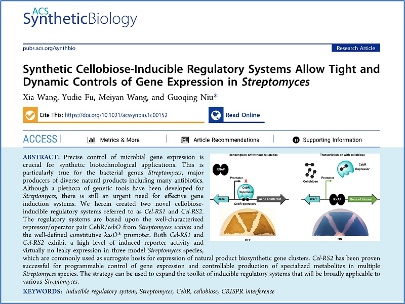 近日,生物技术中心牛国清研究员团队利用模块化设计理念创建了一套新型诱导表达系统,并成功应用于链霉菌基因表达的精确调控,实现了多种化合物的可控合成,相关成果以“Synthetic Cellobiose-Inducible Regulatory Systems Allow Tight and Dynamic Controls of Gene Expression in Streptomyces”为题发表于《美国化学学会·合成生物学》(ACS Synthetic Biology)。2018级硕士研究生王霞为第一作者,2019级硕士研究生付宇蝶和王美燕参与了部分工作,牛国清研究员为通讯作者。