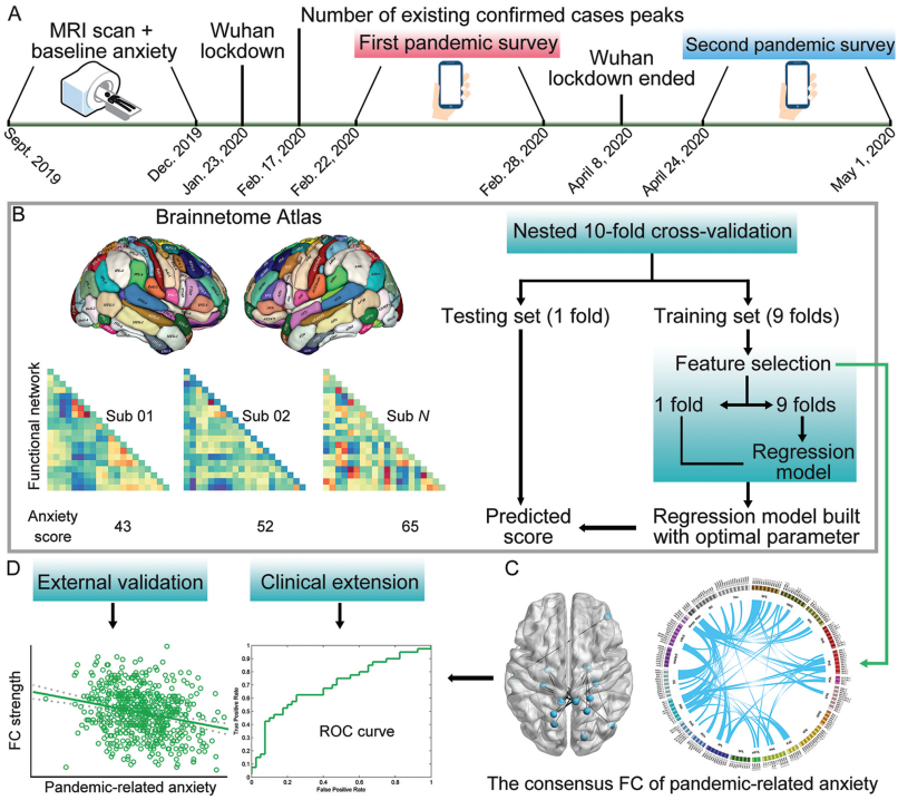研究结果显示,在行为层面,新冠疫情严重期的焦虑水平显著高于疫情前的基线状态,随着疫情好转,缓解期(2020.04.24 — 2020.05.01)的焦虑水平并没有下降反而有显著提升。使用机器学习的预测方法,发现疫情前个体的静息态脑功能连接可显著预测疫情严重期的焦虑分数,但无法预测日常状态下焦虑分数(疫情前)。更有趣的是,能显著预测疫情严重期焦虑的脑功能连接和疫情缓解期的焦虑分数也有显著相关,而且还可泛化到另一个疫情焦虑的独立样本。更进一步的预测分类结果显示,这些大脑功能连接还有效区分了焦虑症和控制组,但对抑郁症和精神分裂症不敏感。上述发现加深了对焦虑的神经基础的认识,为早期识别诊断焦虑障碍个体提供了关键的神经标记,也为情感障碍的神经干预治疗提供了重要的大脑靶点。