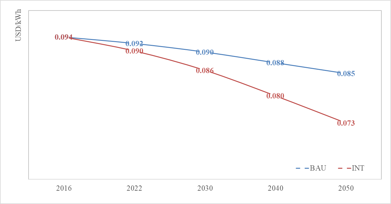 图3 2016-2050年常规情景和综合情景下的单位电力生产消耗