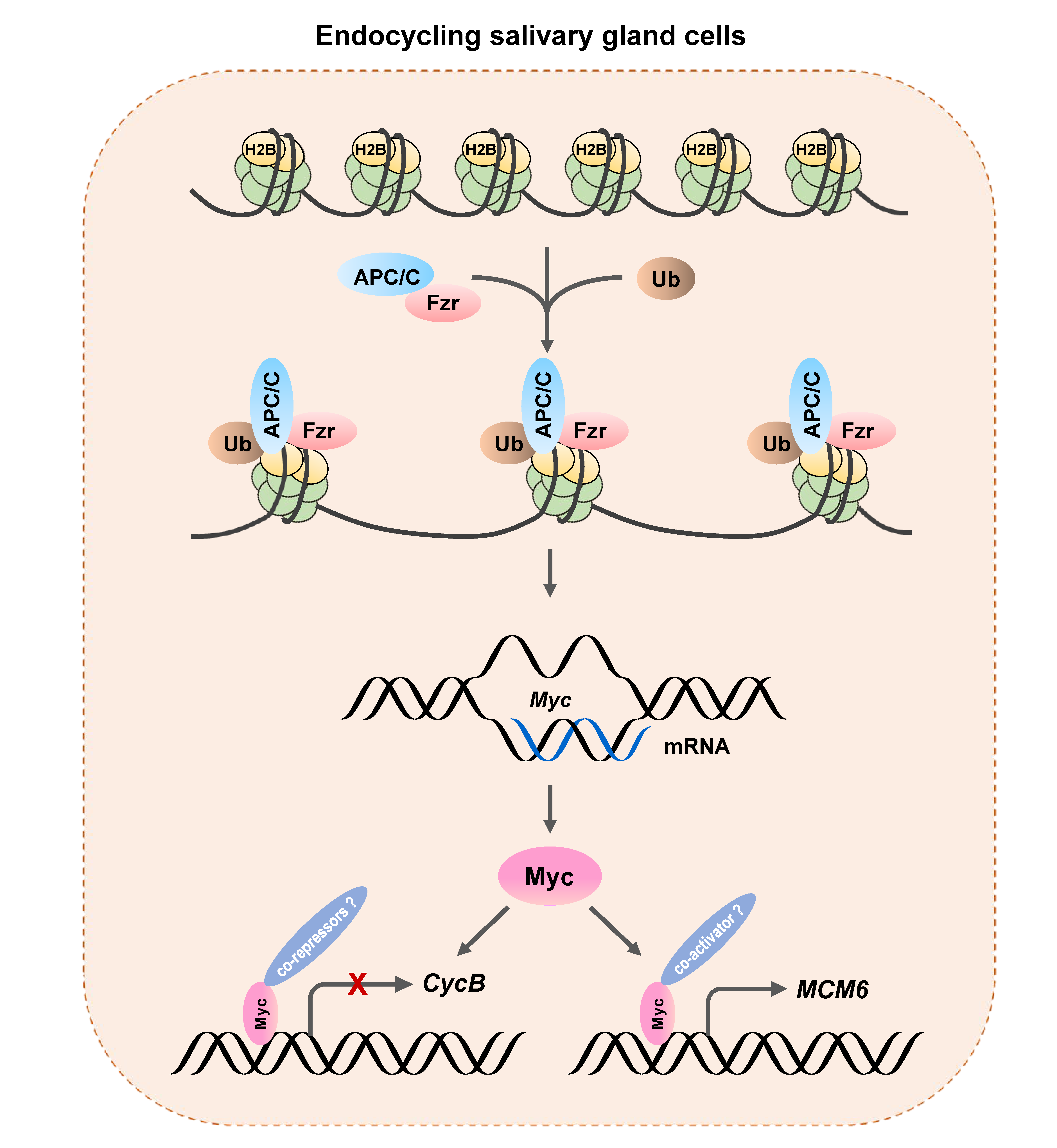 该研究通过在果蝇唾液腺组织及果蝇和人源细胞系中对果蝇、家蚕和人源Fzr基因的遗传操作分析发现,转录因子Myc是Fzr蛋白的下游信号分子,Fzr组织特异性敲降所导致的DNA复制停滞和细胞生长受阻等异常表型可被Myc过表达回救。结合蛋白质谱测序和染色质免疫共沉淀分析证实,Fzr能与组蛋白H2B发生互作,从而增强Myc基因启动子区H2B的泛素化(H2Bub)水平,促进Myc基因转录。进一步的研究表明,Myc不仅可直接抑制CycB基因的转录,而且对DNA复制过程所必需的微小染色体维持蛋白家族成员MCM6基因的转录具有直接的促进作用。该研究揭示了Fzr-H2Bub-Myc级联途径对细胞核内复制及细胞生长的重要调控作用,不仅有助于理解细胞的增殖和生长调控机制,也可为提高家蚕丝腺细胞中DNA复制及丝蛋白合成的遗传改造提供新思路。