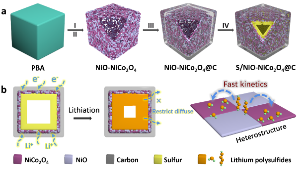 针对这些问题,徐茂文教授课题组设计并合成了双层核壳NiO-NiCo2O4异质结@C空心纳米笼作为硫的载体,并首次应用于锂硫电池中。这种空心结构不仅能够为硫的存储提供充足的空间,还能有效应对硫充放电过程中的体积效应;此外,NiO-NiCo2O4异质结纳米笼能够利用自身组成的独特优势,有效抑制多硫化物溶解扩散并促进其转化反应中的动力学过程,缓解电池的穿梭效应,充分体现了异质结的优势。基于这种独特的设计,该材料作为锂硫电池的正极,表现出较高的比容量以及良好的循环稳定性。