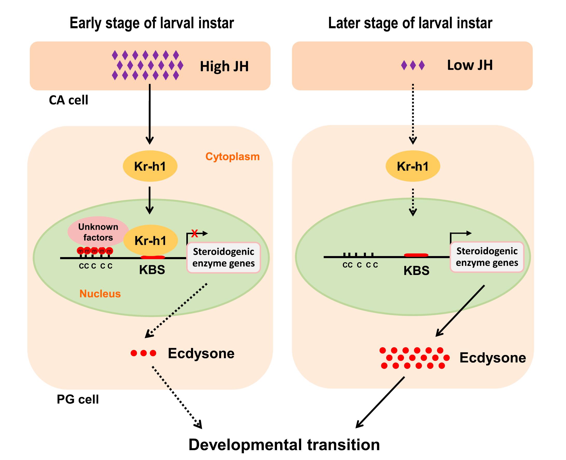 本研究结合家蚕和果蝇两个模式系统,通过组织特异性遗传操作及个体和细胞水平的生化实验证实,JH可直接作用于前胸腺并诱导Kr-h1表达,Kr-h1进而可直接与ecdysone合成酶基因启动子区的关键顺式作用元件(KBS)结合并诱导启动子发生DNA甲基化,从而抑制ecdysone合成酶基因的转录和ecdysone的合成,最终阻碍蜕皮与变态发育,使幼虫生长状态得以维持。上述发现揭示了昆虫JH信号通路在转录水平直接负调控ecdysone合成的新机制以及表观遗传修饰在ecdysone合成中的潜在调控作用,丰富完善了JH与ecdysone在调控昆虫生长发育过程中的互作网络。