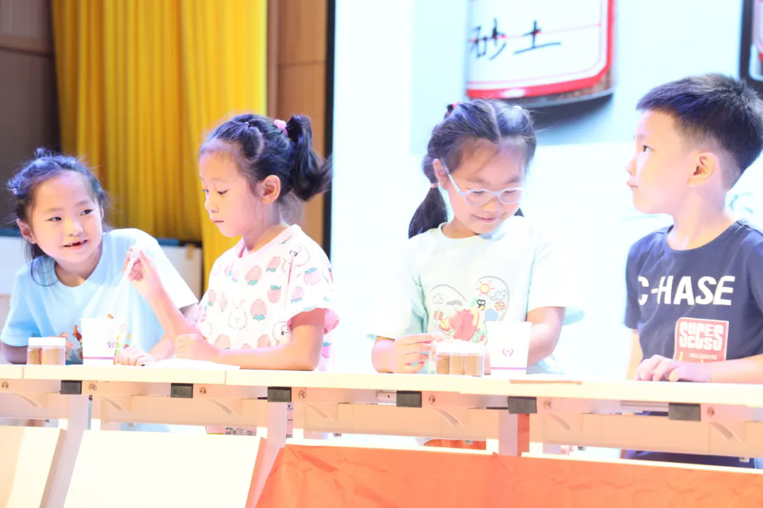 将气氛推到高潮的是讲座中讲师与我校学生进行的实验互动。在进行土壤测试实验环节时,同学们积极举手自荐,化身“小小科学家”体验侯光炯院士研究工作的一环:去摸一摸,感受土壤外部特征;去揉一揉,比较土壤粘性;去猜一猜,比较土壤的渗水性。同学们在实验中认识了不同质地的土壤,学会找到不同场景适用的土壤。趣味小实验激发了同学们对科学的兴趣并鼓励他们在实际生活中运用科学。