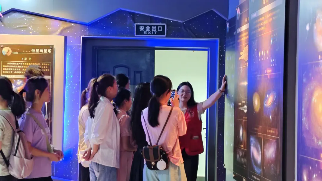 在科普志愿者的带领下,同学们首先来到了天文馆,一踏入天文馆,丰富有趣的科普展板和天文模型立刻吸引了大家的注意力。同时,在科普志愿者严谨而又生动的讲解下,同学们展示出对科普展板内容的极大兴趣并与志愿者进行了积极的互动。此外,同学们还参观了天球仪、月球仪等天文仪器,对天空上的星座、月球上凹凸不平的地形等天文知识有了更具体深入的了解。
