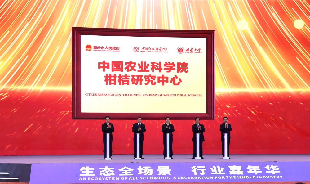 10月25日,中国农业科学院柑桔研究中心在2024重庆市食品及农产品加工高质量发展产业生态大会开幕式上揭牌成立。重庆副市长郑向东、江敦涛;中国农业科学院副院长叶玉江;学校党委书记张卫国为中国农业科学院柑桔研究中心揭牌。中国农业科学院科技局局长李新海,学校党政办公室、科学技术处、柑桔研究所等单位负责人以及与会嘉宾见证揭牌。