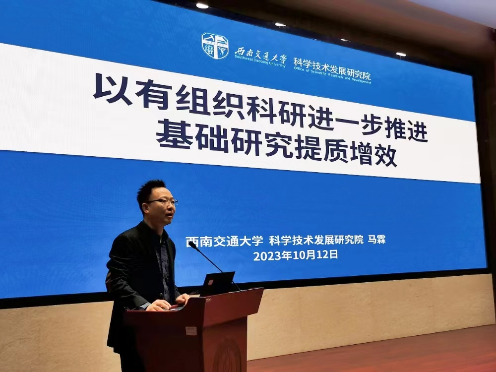 会议第一阶段,西南交通大学科学技术发展研究院马霖副院长作了题为“以有组织科研进一步推进基础研究提质增效”的报告,介绍了西南交通大学的学科特色及行业优势,开展有组织科研工作,以及国家自然科学基金组织申报方面的经验和特色做法。