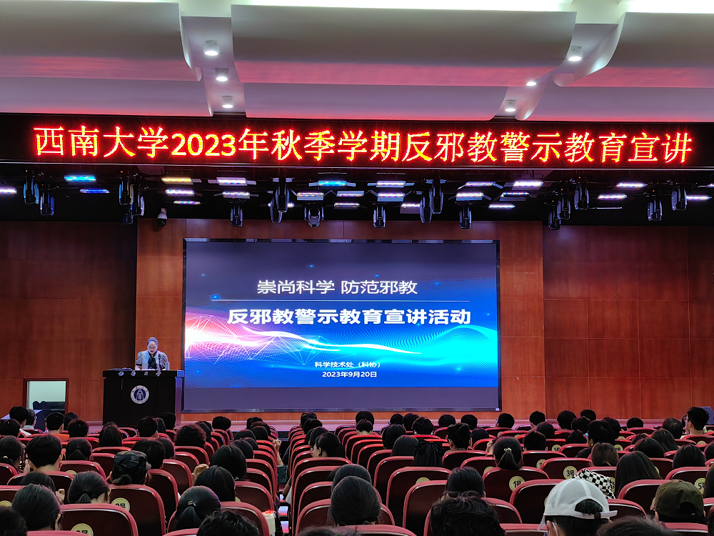 9月20日下午,学校科协开展2023年秋季学期反邪教警示教育宣讲活动,国家治理学院曾维加教授出席活动并做主题宣讲,党委研究生工作部、学生工作部、党委保卫部等有关部门及学生代表400余人参加了活动。活动由科学技术处副处长、科学技术协会秘书长李雪梅主持。