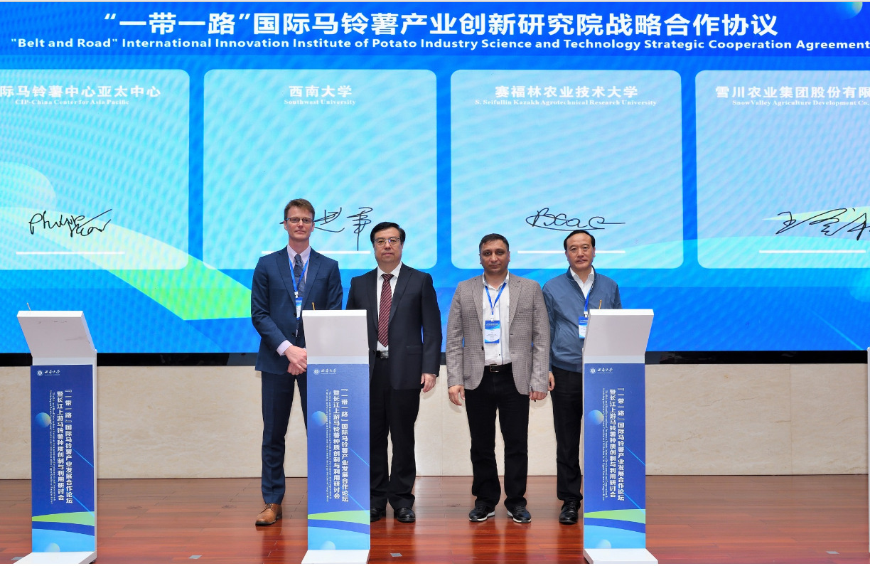 中国科学技术交流中心副主任庄嘉、学校副校长王进军、农业农村部人力资源开发中心副处长李厥桐等出席仪式。王进军、中国种子协会马铃薯分会会长王登社、国际马铃薯中心亚太中心国家联络科学家Philip James Kear博士、哈萨克斯坦塞弗林农业科技大学Vadim Khassanov教授代表各方签署合作协议。国家马铃薯产业体系首席科学家金黎平研究员、国际马铃薯中心育种部主任Hannele Lindqvist-Kreuze博士等人进行了倡议书发布。重庆市农业农村委员会二级巡视员周敏、中国科学技术交流中心欧亚处负责人万聪、中国西部(重庆)科学城种质创制大科学中心首席科学家夏庆友教授、中国种子协会原副会长兼秘书长李立秋等出席见证。