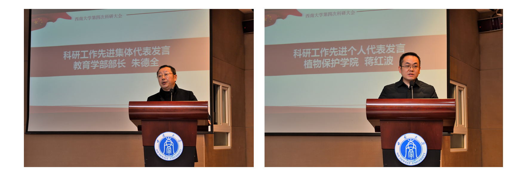 会上,一批在“十三五”科研工作中表现突出的先进集体和先进个人获表彰,教育学部等20个教学科研二级单位获“十三五”科研工作先进集体称号;王本朝等84人获“十三五”科研工作先进个人称号,校领导为全体获奖集体和获奖个人代表颁奖。教育学部朱德全部长和植物保护学院蒋红波教授分别作为先进集体和先进个人代表,在大会上进行交流发言。