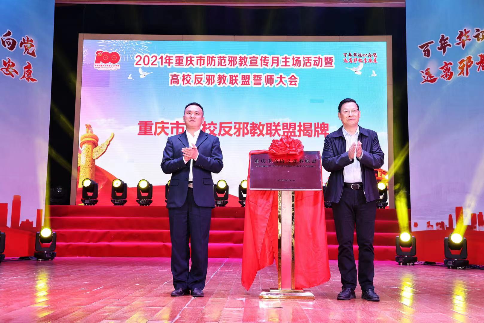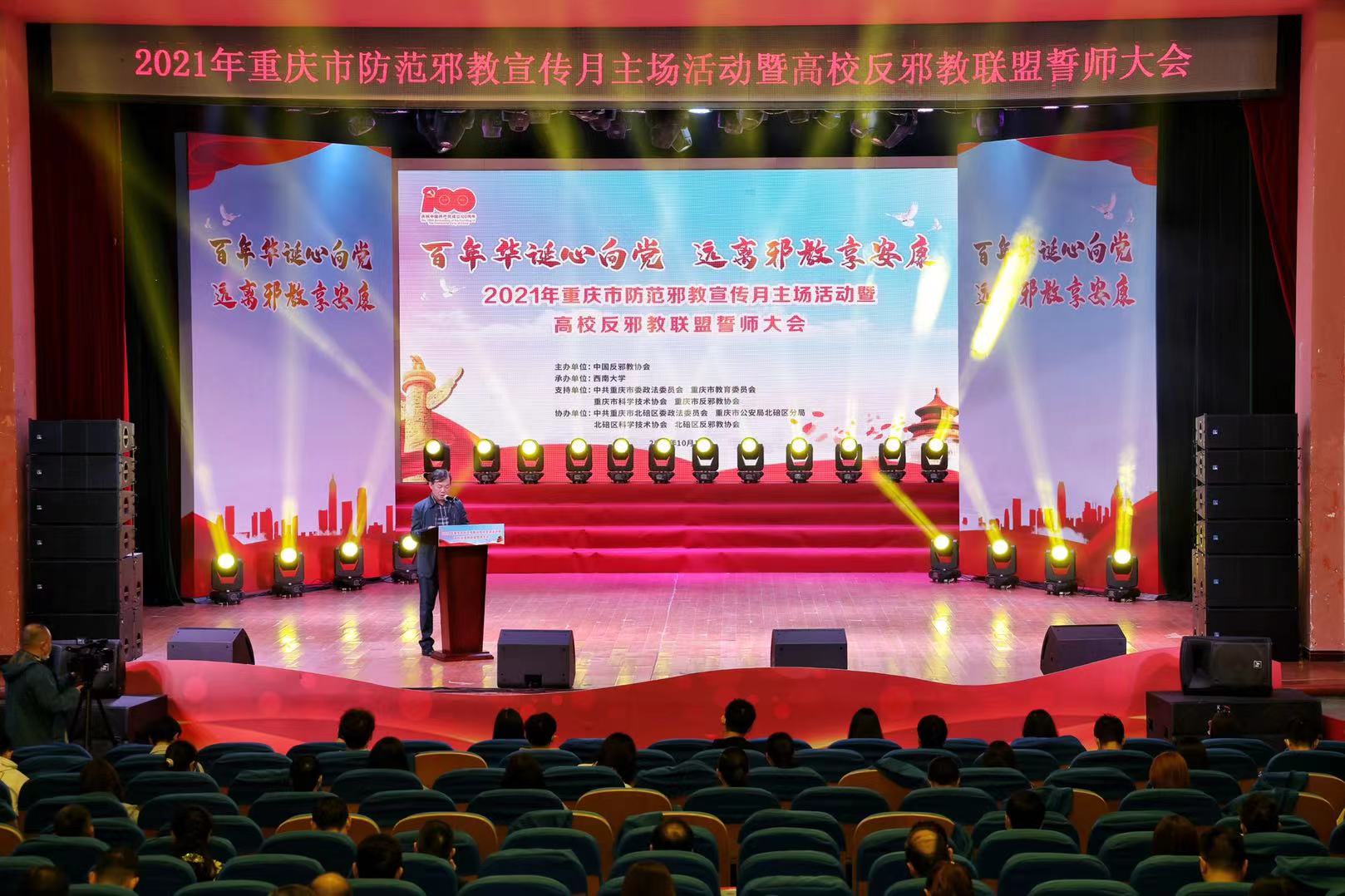 10月12日上午,以“百年华诞心向党 远离邪教享安康”为主题的2021年重庆市防范邪教宣传月主场活动暨高校反邪教联盟誓师大会在学校光大礼堂隆重举行。市科协党组成员、副主席陈昌明,市委教育工委委员、市教委副主任邓沁泉,市民族宗教委党组成员、副主任周先常,北碚区委常委、政法委书记苟鹏,学校副校长崔延强,学校宣传部、校科协、保卫处负责人出席活动。启动仪式由市科协党组成员、二级巡视员,市反邪教协会常务副会长牛杰主持。