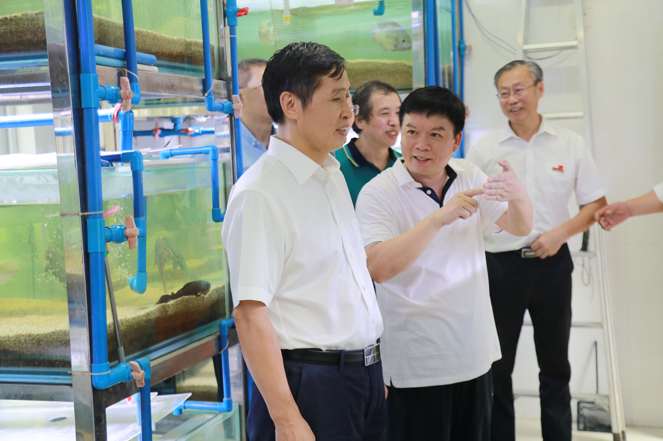 随后,钟部长一行来到淡水鱼类资源与生殖发育教育部重点实验室,参观实验室标本馆,听取了实验室负责人对实验室研究方向、取得的成果的介绍,重点了解了罗非鱼进行性别调空、体色控制,全雄罗非鱼的育种方面的进展情况。