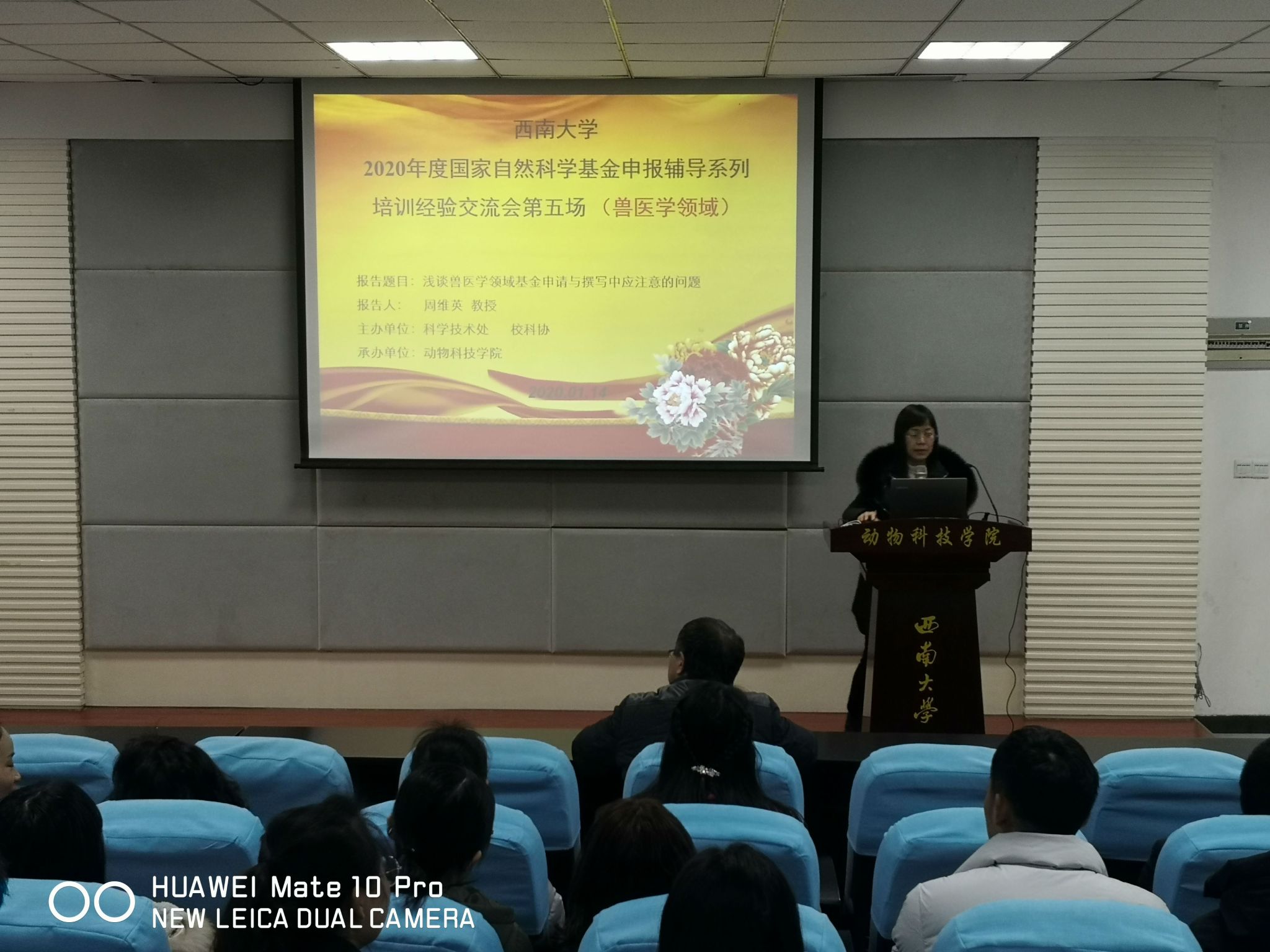 为切实做好2020年度国家自然科学基金申报工作,进一步提升我校国家自然科学基金项目申报质量和中标率,1月14日上午,由科学技术处、校科协主办,动物科技学院承办的【含弘讲坛】2020年度国家自然基金申报辅导系列培训经验交流会第五场在动物科技学院98教学楼报告厅举行。本次报告会邀请到的是国家自然科学基金(NSFC)评审专家,中美(NSFC-NIH)合作项目评审专家、原第三军医大学药理学教研室主任,现重庆医科大学药物代谢重庆市重点实验室副主任周维英教授。动物科技学院方仁东副院长主持报告会,相关专业方向60余名师生参加。
