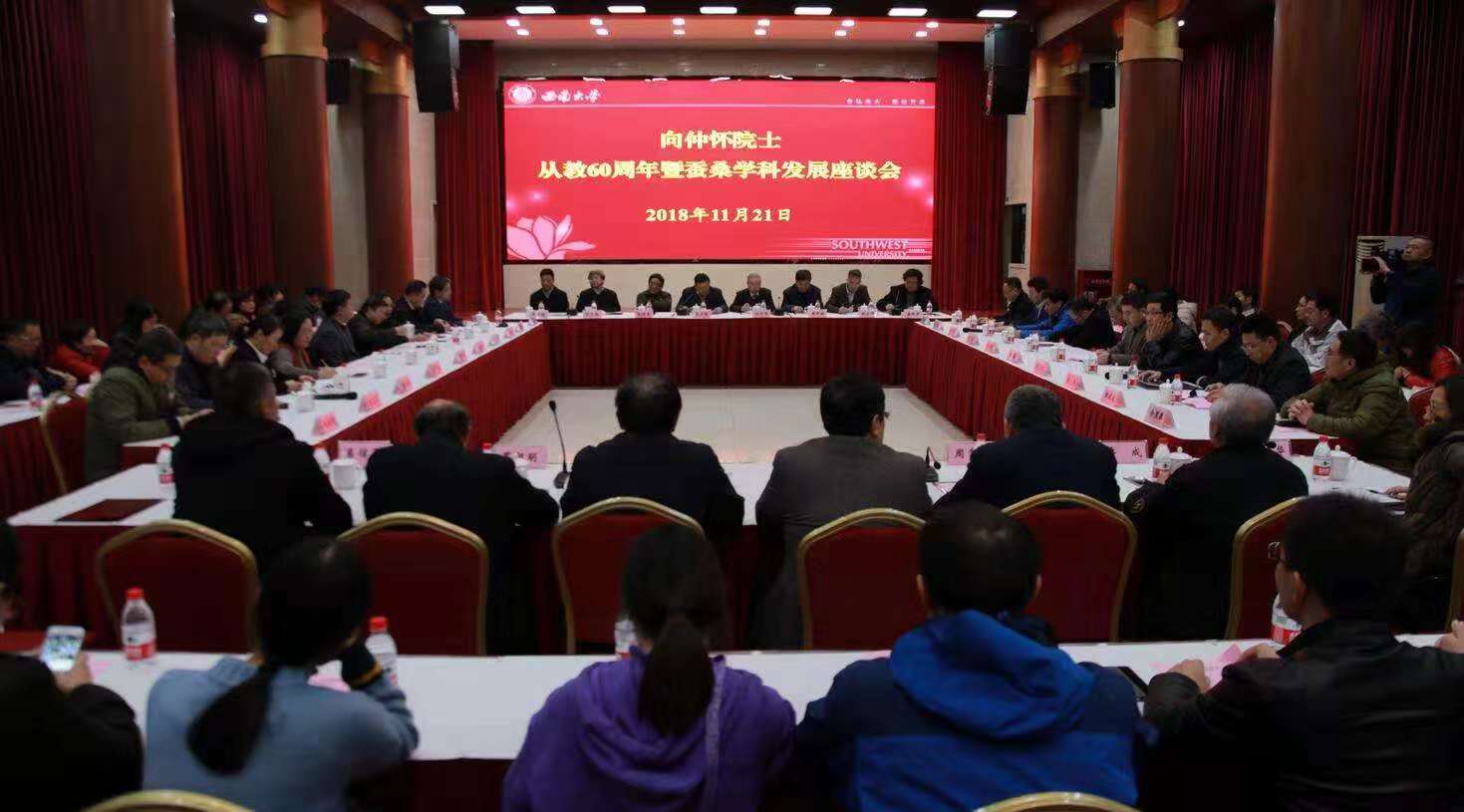 向仲怀院士对学校举办60周年座谈会表示十分感动和感谢,他回忆了个人、学科、学校的相融、互进的历程以及深厚情感。希望大家通过座谈会,在庆祝改革开放40周年的意义下,凝聚共识、形成合力,进一步加强蚕桑学科发展和学校的双一流建设。