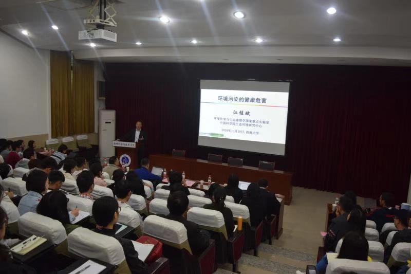为了学校环境医学的发展,10月19日,校科协和发光与实时分析化学教育部重点实验室举办环境医学分析研讨会,会议邀请了中国科学院生态环境研究中心江桂斌院士开展院士论坛,国家自然科学基金委优秀青年基金获得者环境化学与毒理学国家重点实验室阮挺、曲广波副研究员,南京医科大学刘起展教授及中山大学韦艳宏教授做了特邀报告。来自药学院、化学化工学院、资源环境学院、材料能源学部等多个学院200余名师生参加会议。会议由校科协副主席黄承志教授和国家自然科学基金委优秀青年基金获得者、药学院宋杨教授主持。